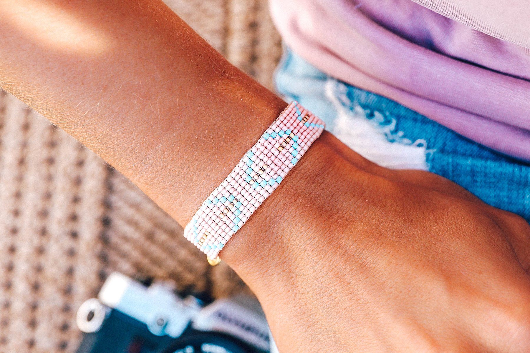 Look like a total beach bum (in the best way possible!) with our Chevron Seed Bead Bracelet. This colorful design features soft shades of sand and sea water, with a wide beaded band and simple chevron pattern. Wear it solo with your bathing suit or stacked with other styles for an off-the-beach look that’s super laid-back.