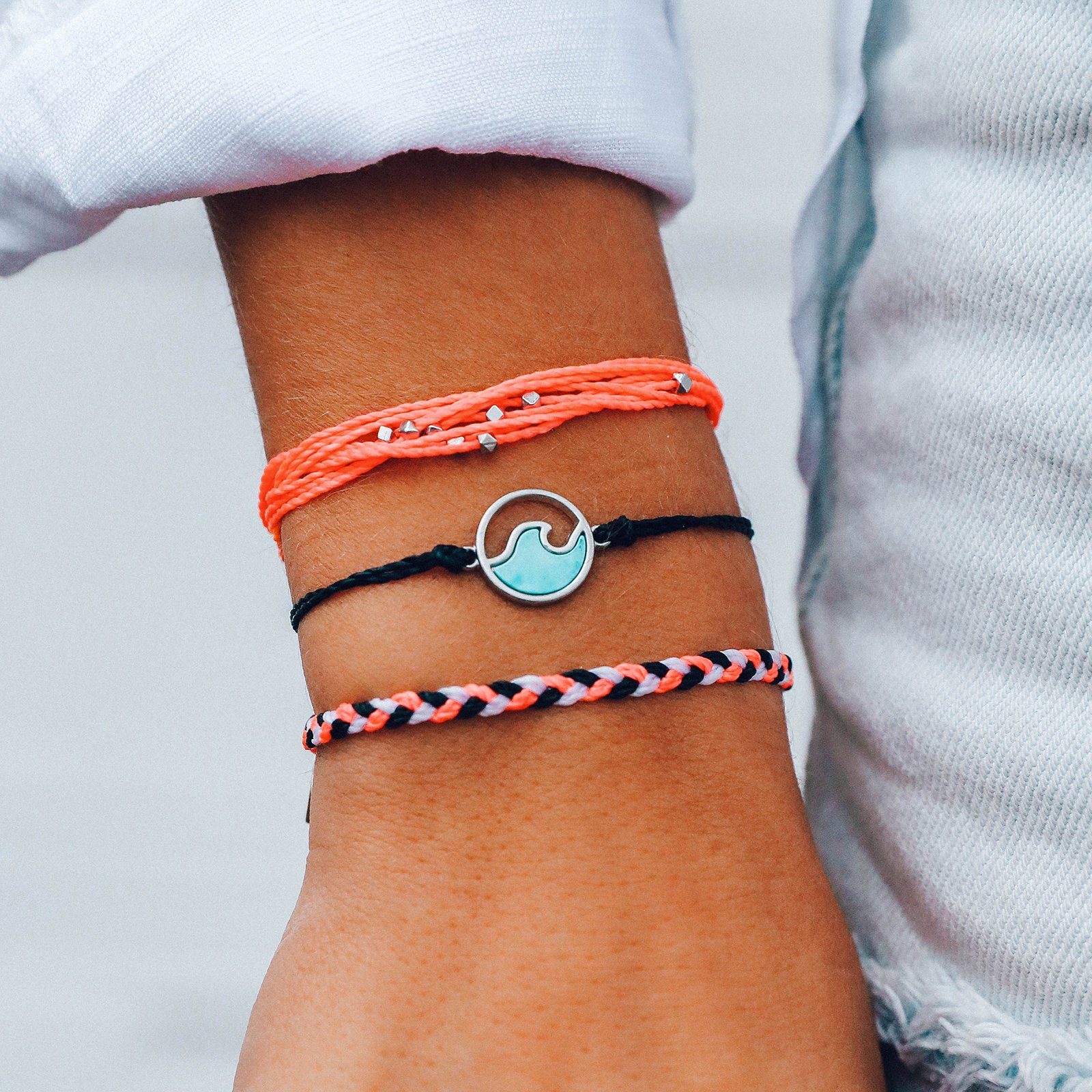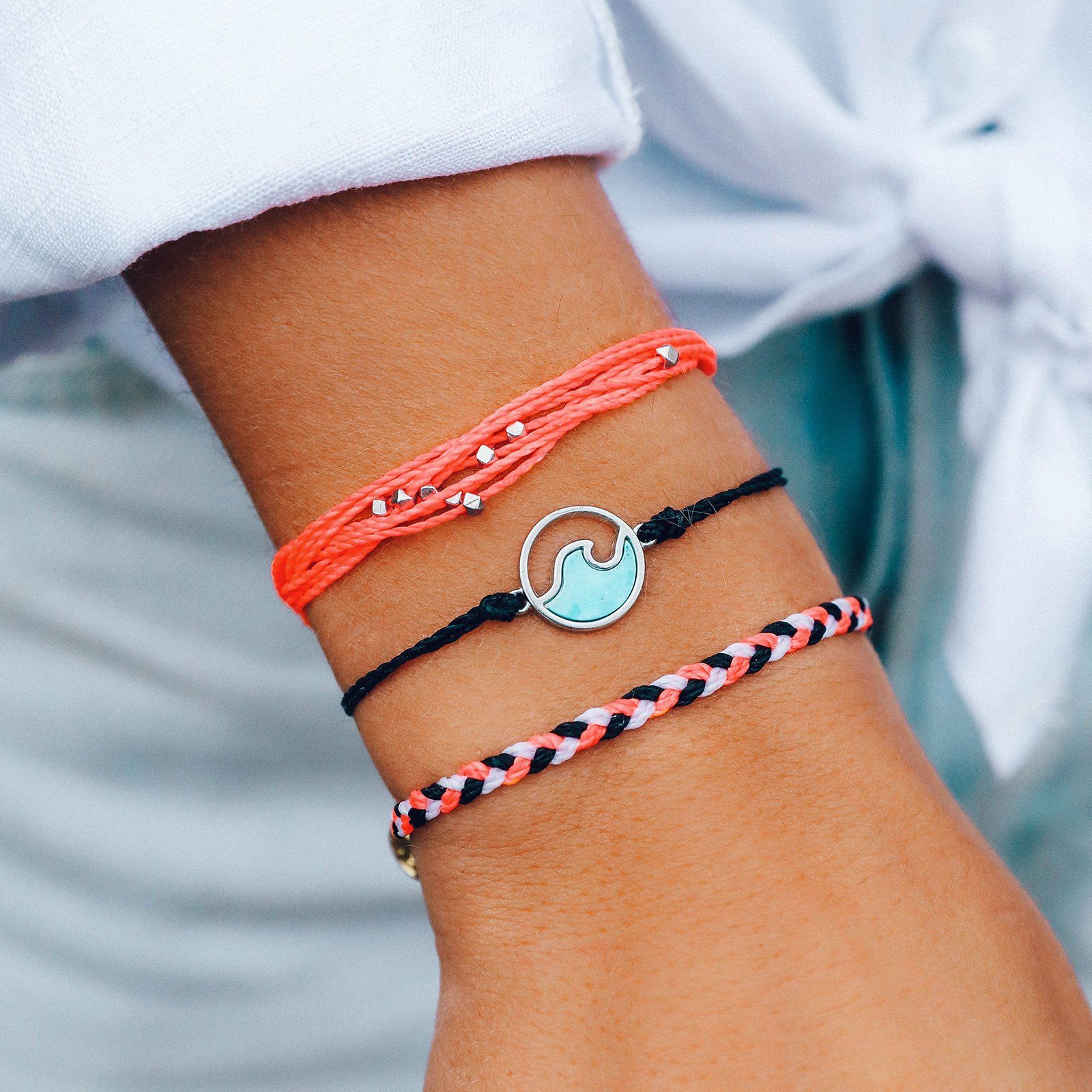 Stand out from the crowd with our Coral Bay Pack. This trio of bold bracelets features a color-packed coral Malibu, a tri-color friendship bracelet, and a turquoise-filled Wave Charm Bracelet (made with 100% genuine turquoise!).