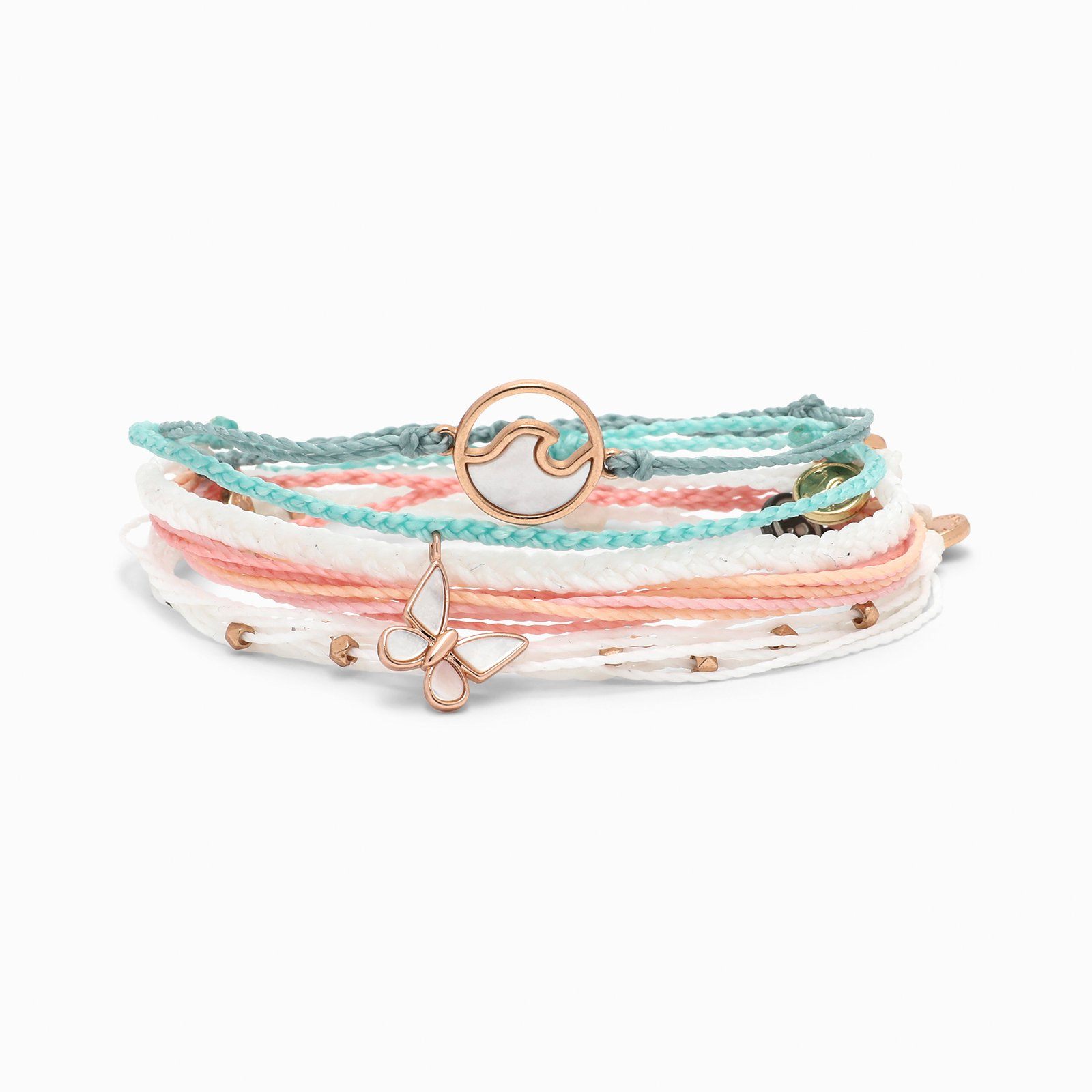 Searching for the perfect spring stack? Well, this is it! Our Monarch Grove Pack comes in pretty pastel shades and five must-have styles: a fresh white Malibu, a super-sweet Original, a simple friendship bracelet, a bitty braid design with a dangling butterfly charm, and a mother of pearl Wave Charm Bracelet.