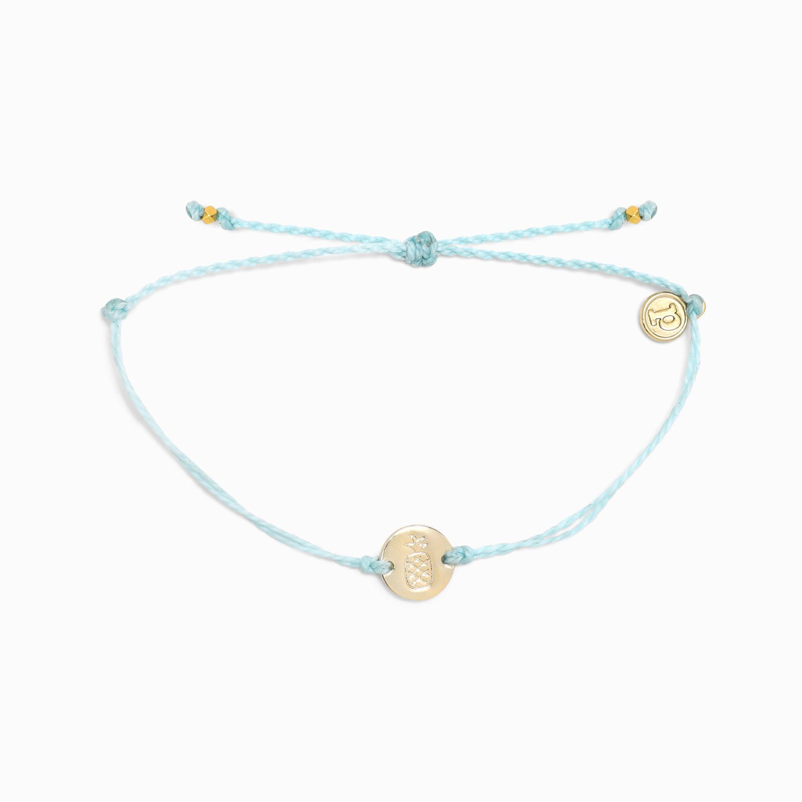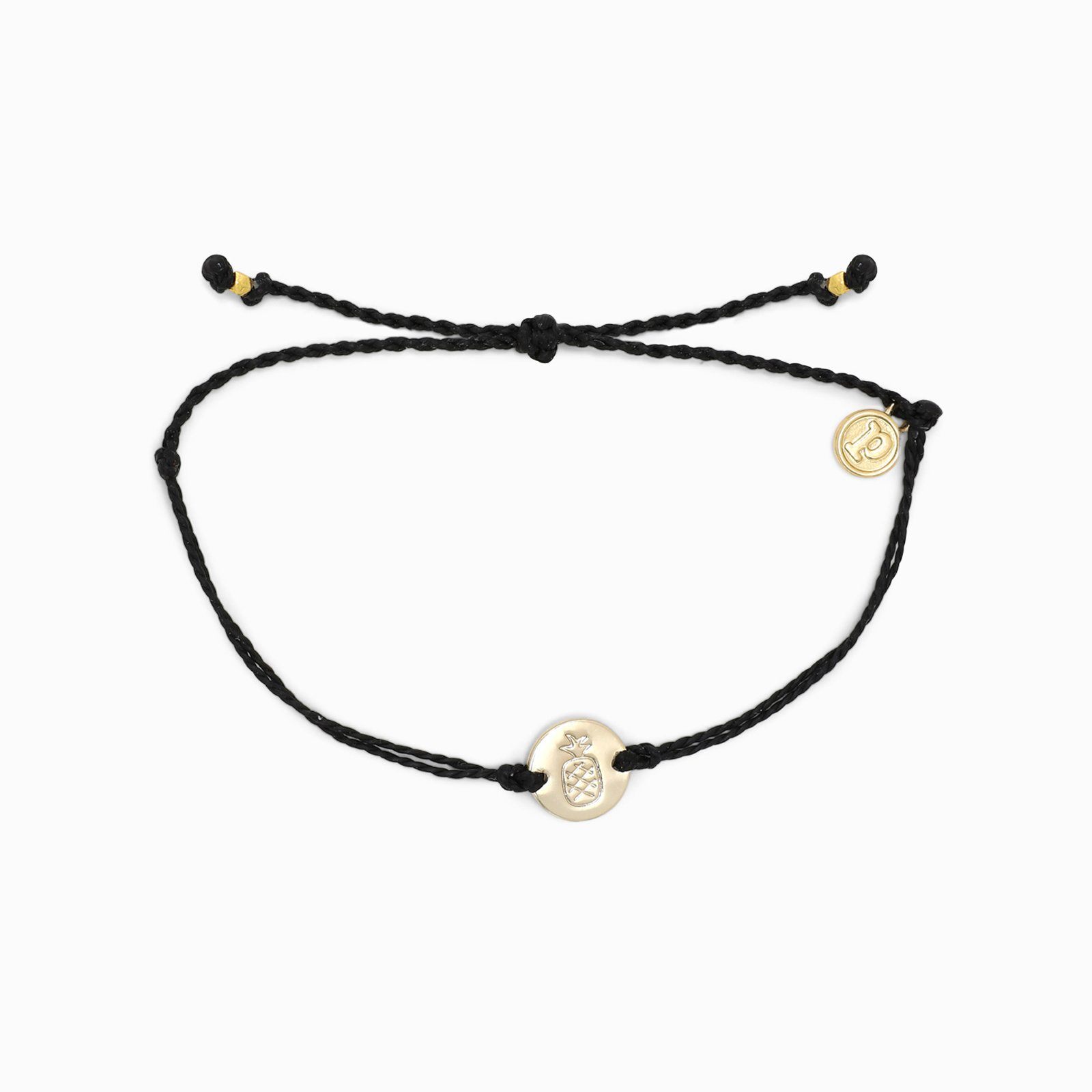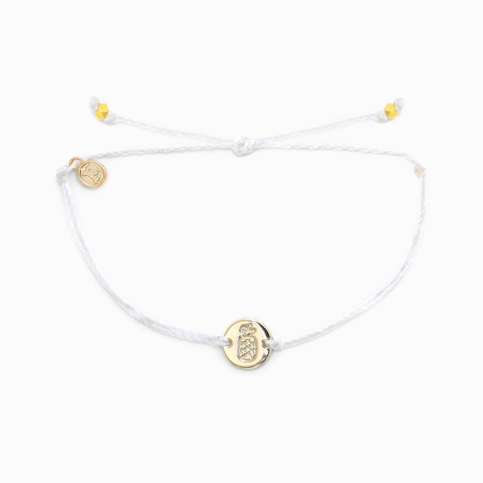 Who knew fruit could be so cute?! Our Pineapple Coin Bracelet is designed with a simple string band and double-sided gold charm. Wear it one way for a pretty pineapple etching, then flip it over for a Hawaiian “hello”!